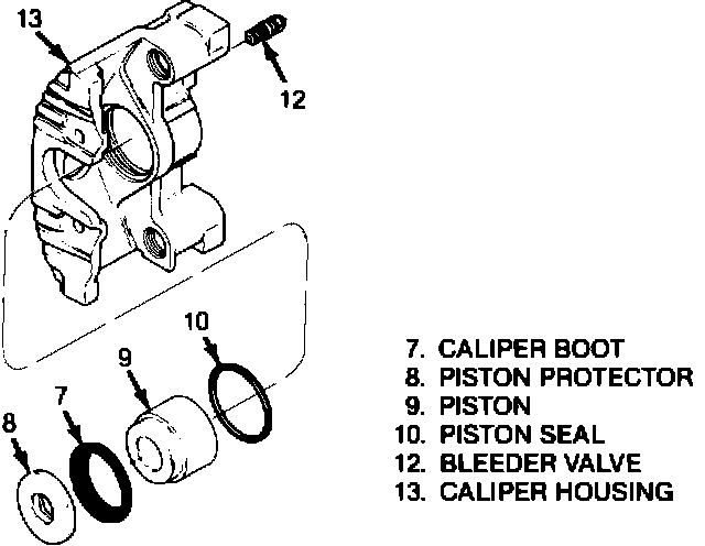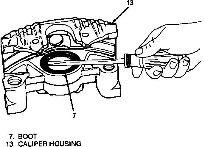 4. Piston seal (10) from groove in caliper (13) bore with a small wood or plastic tool. Do not use a metal tool since this may damage caliper bore or seal groove.