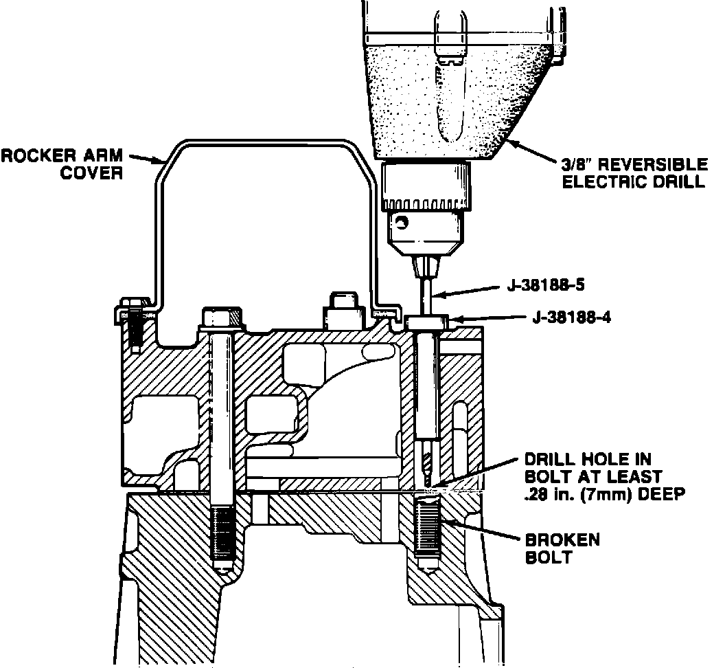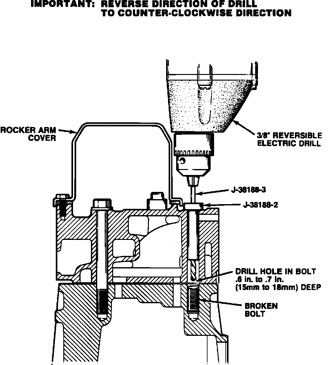IMPORTANT: TOOL J-38188-3 IS A LEFT-HAND TWIST DRILL - IT IS CRITICAL THAT THE ROTATION OF THE ELECTRIC DRILL BE REVERSED PRIOR TO USING THE DRILL. ROTATION OF THE DRILL SHOULD BE COUNTER-CLOCKWISE.