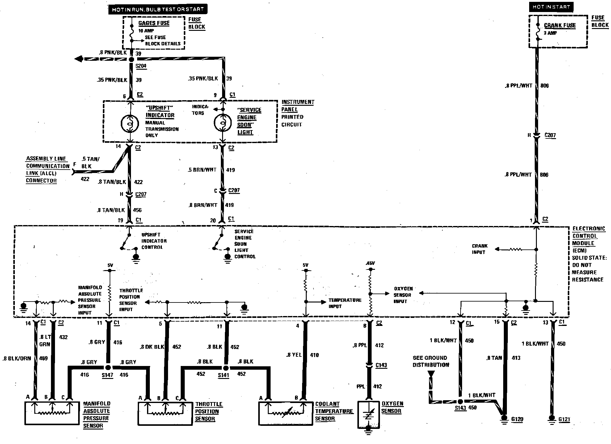 Throttle Body Injection Wiring Circuit (Engine Data Sensors, Service Engine Soon & Upshift Indicator):