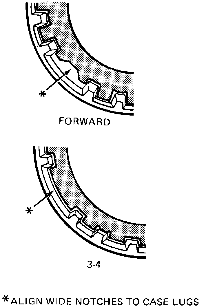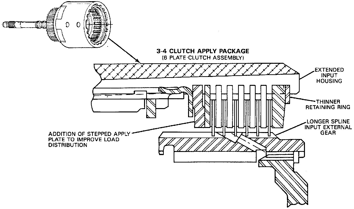 NOTE: A new 3-4 clutch apply package is now in production starting February 9, 1987. A new 3-4 clutch apply plate (stepped) replaces a flat apply plate. The input housing and shaft assembly is revised with longer housing splines for using the new 3-4 clutch apply plate. A new input internal gear with longer splines on the outside diameter is used. This package also eliminates usage of the longer 3-4 clutch apply ring (now using only the short 3-4 clutch apply ring on all models). New 3-4 backing plates are used. A new internal retaining ring (thinner and end configuration is changed or identification. The changes described here only apply to transmissions built after February 9, 1987 (Julian date 040).