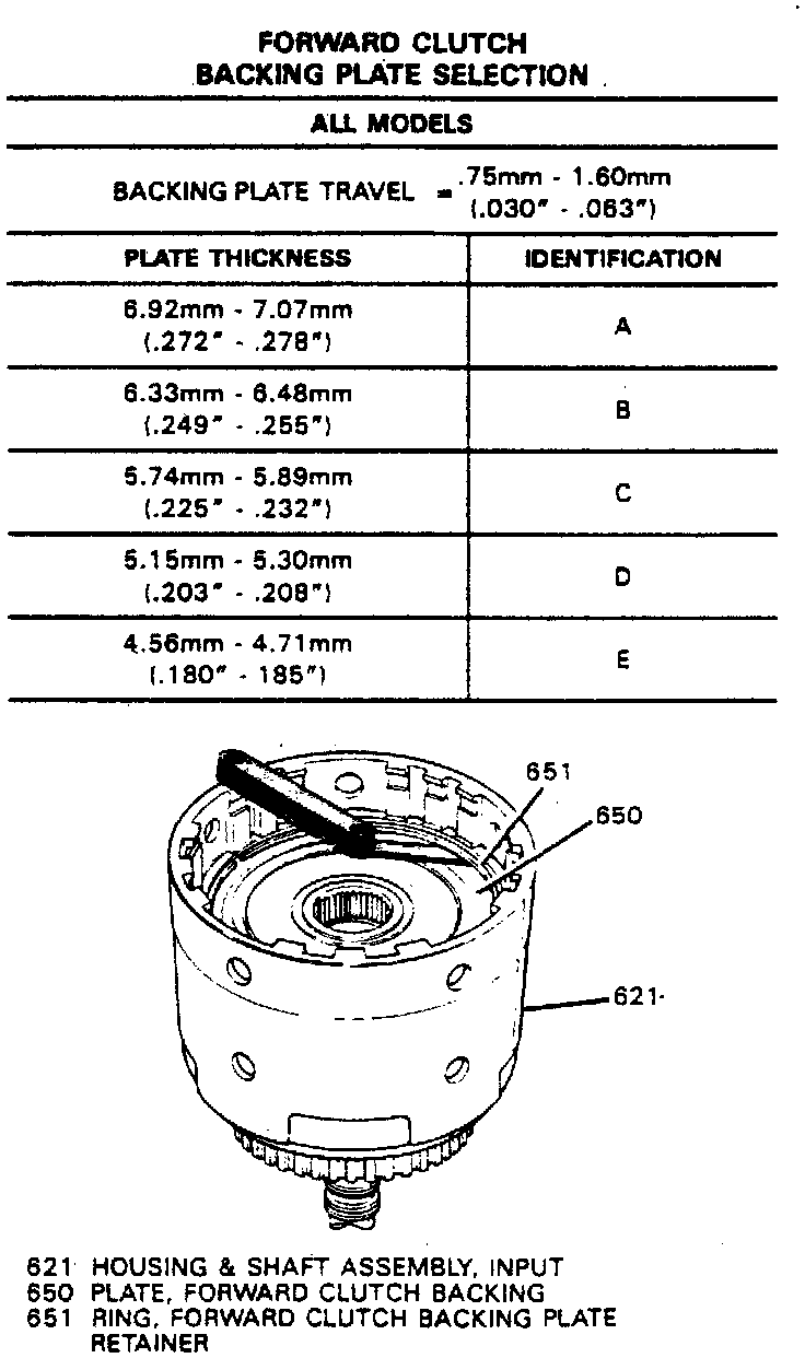 c. Proper forward clutch backing plate travel should be 0.030-0.063 inch.