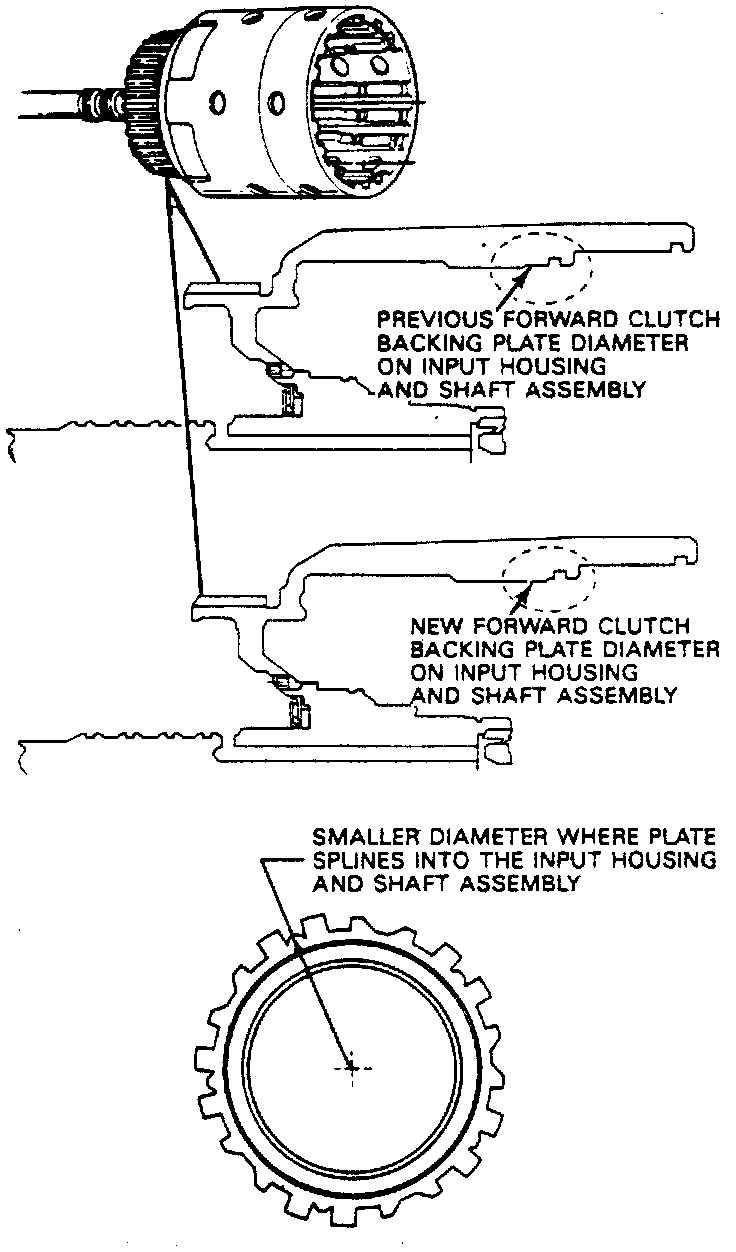 23. Install forward clutch backing plate with chamfered side up. A new forward clutch backing plate is now in production. The new backing plate is smaller in diameter also the input housing and shaft assembly with larger splines that match the forward clutch backing plate splines, Fig. 586 is used. The new forward clutch backing plate or the new input housing and shaft assembly cannot be used on transmissions.