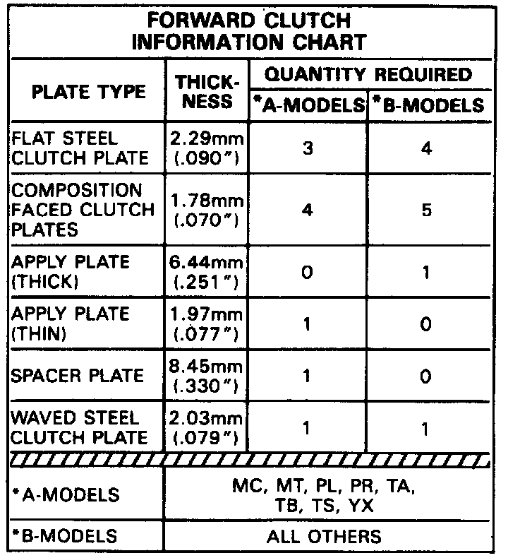 19. A forward clutch which requires five steel forward clutch plates will use a single thick apply plate. A forward clutch which requires four steel forward clutch plates will use a thin apply plate and thick spacer plate.
