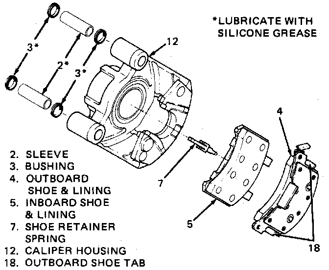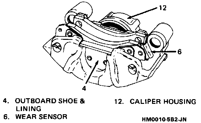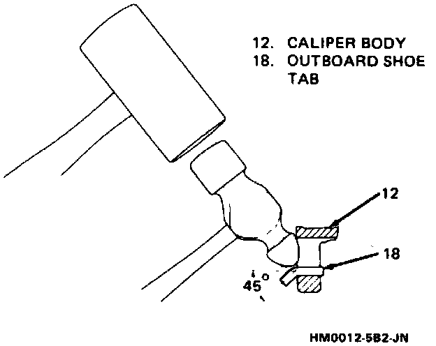 NOTE: If an outboard shoe is removed from the caliper, or the tabs unclinched for any reason, then it will be necessary to replace the shoe and lining assemblies. Do not re-clinch outboard shoe locking tabs after having removed shoe from caliper.