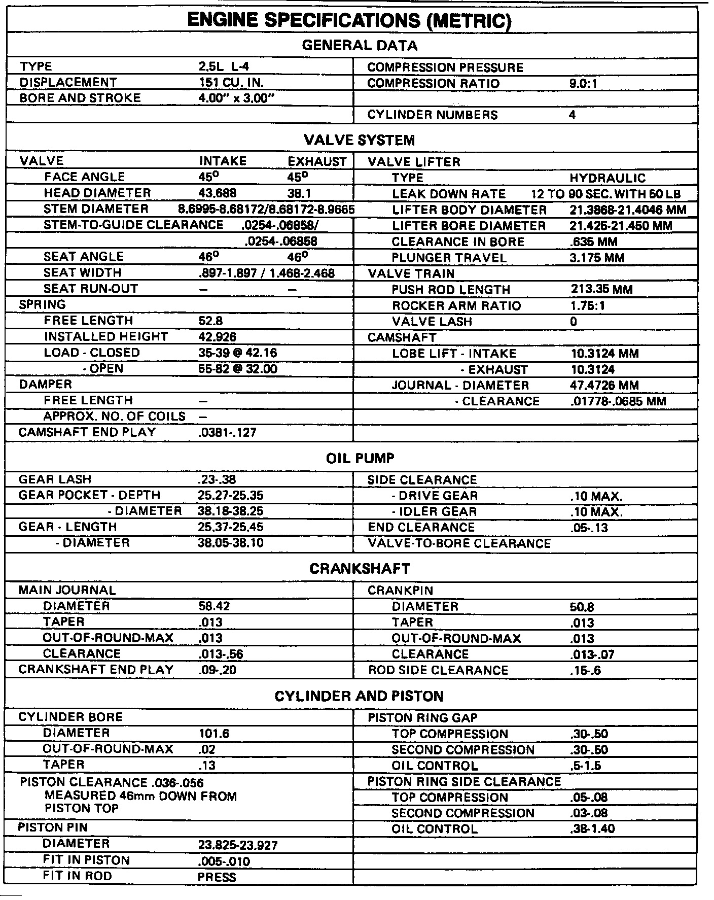 Engine Specifications (METRIC):