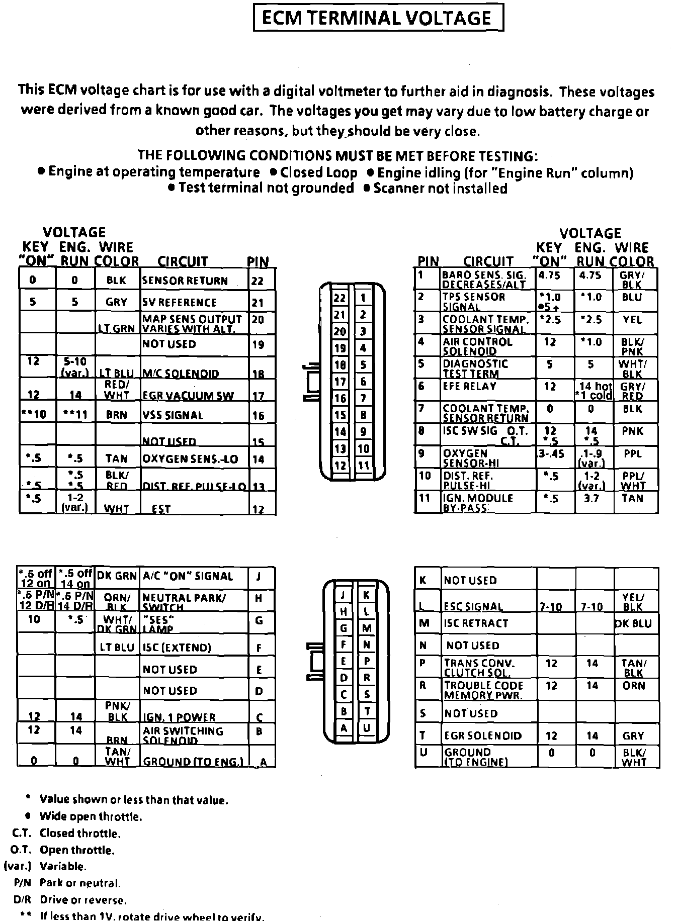 Fig. 037 - ECM Connector Terminal Identification & Voltage Specifications.: