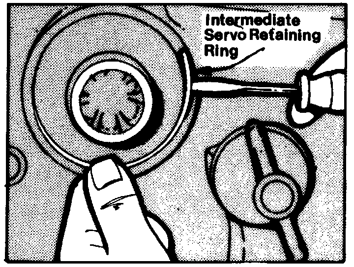 4. Compress intermediate servo cover using tool J-29714 or equivalent, remove retaining ring, see first image, then remove cover and seal ring, see second image, with suitable pliers.
