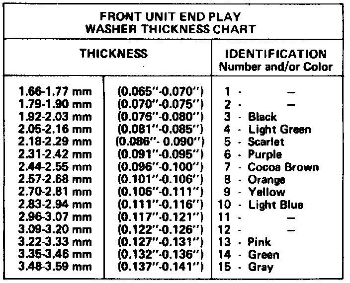 g. Pull upward on tool J-24773 and read endplay. Front unit end play should be 0.022-0.051 inch (0.56-1.3 mm). Selective washer which controls this endplay is located between the output shaft and turbine shaft. If more or less washer thickness is required to bring endplay within specifications, select proper washer from chart in image.
