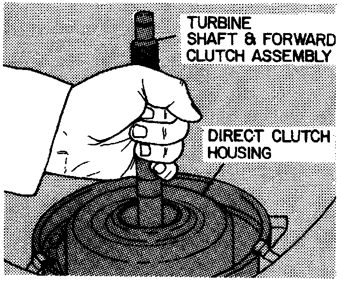 12. Lift direct clutch assembly off forward clutch assembly. Direct to forward clutch thrust washer may adhere to end of direct clutch housing when it is removed from forward clutch housing.