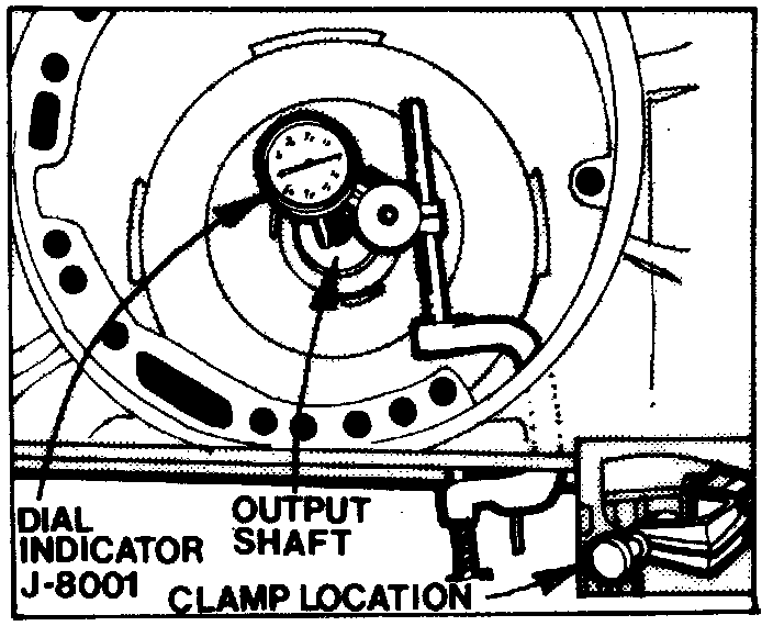 b. Install dial indicator on case, then place pointer against output shaft and zero dial indicator, see image.