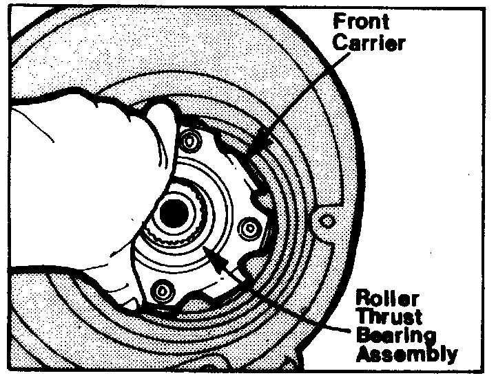 18. Remove front carrier assembly and front internal gear to front carrier roller bearing assembly, see image. Front sun gear to front carrier thrust bearing may come out as the front carrier is removed.