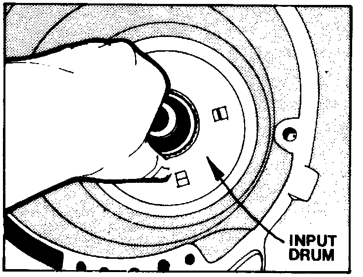 20. Remove input drum and rear sun gear, see image, then remove the tanged input drum to reverse clutch housing thrust washer from rear of input drum or reverse clutch housing. If low and reverse clutch housing assembly has to be removed, the low and reverse clutch piston travel must be checked.