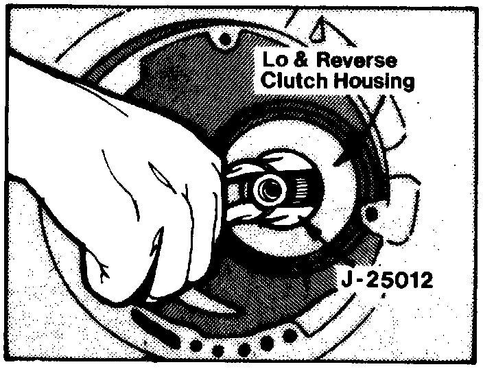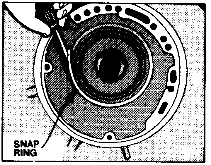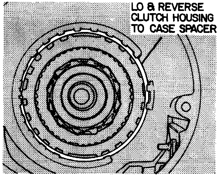 22. Remove low and reverse clutch housing to case snap ring, see image. Flat side of snap ring should be against low and reverse clutch housing with beveled side up.