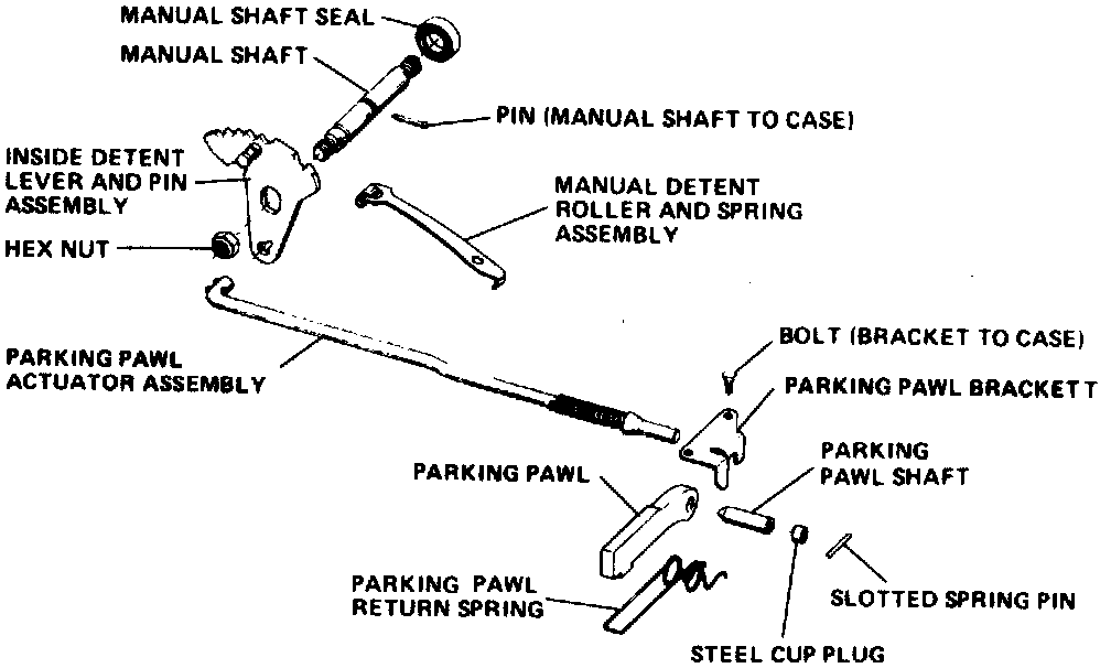 33. Remove park bracket and parking pawl shaft retaining pin, then using a 4 (6.3 mm) easy out, remove parking pawl cup plug, see image above step 30.