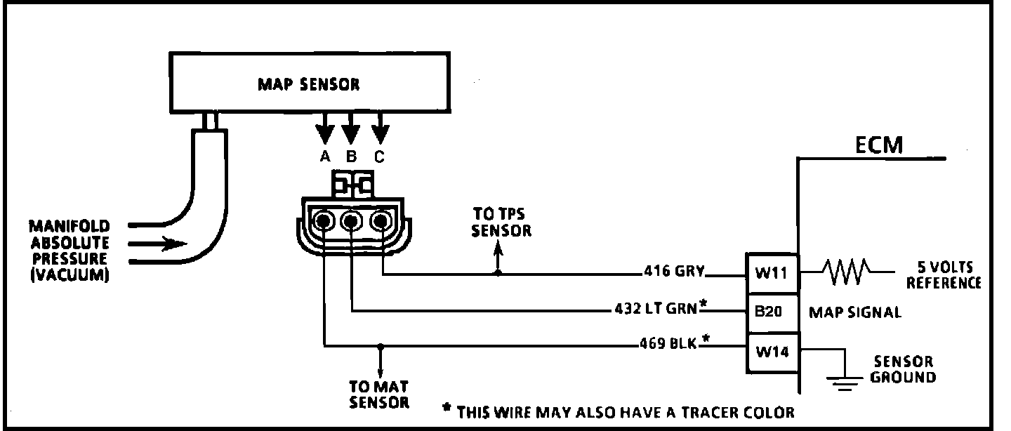 Circuit Description: The Manifold Absolute Pressure Sensor (MAP) measures manifold pressure (vacuum) and sends that signal to the ECM. The MAP Sensor is mainly used for fuel calculation, when the ECM is running in the throttle body backup mode. The MAP Sensor is also used to determine the barometric pressure and to help calculate fuel delivery.