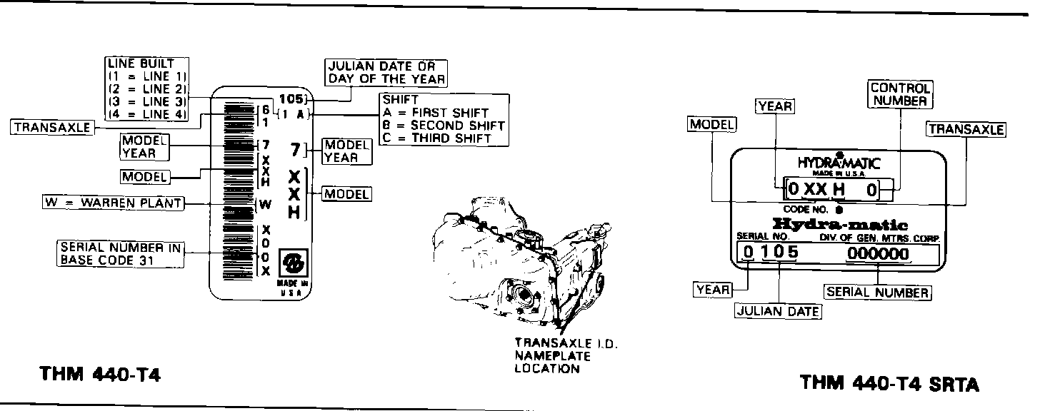 FIGURE 1 - THM 440-T4 TRANSAXLE IDENTIFICATION INFORMATION: