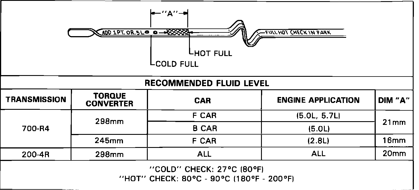 When cold, 27 Degrees C (80 Degrees F), a full THM 200-4R, and 700-R4 transmission will show the fluid level to be below the "Add" mark on the fluid level indicator (refer to Figure 1). As the transmission warms to normal operating temperature the fluid expands raising the level to within the cross-hatched area on the fluid level indicator.