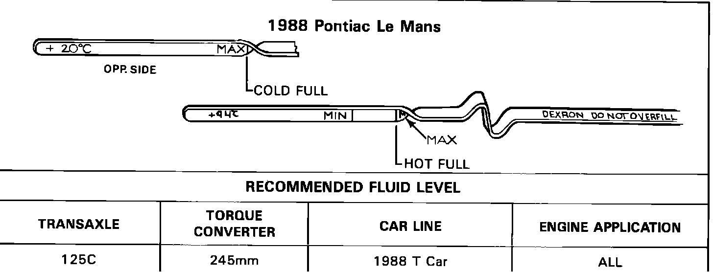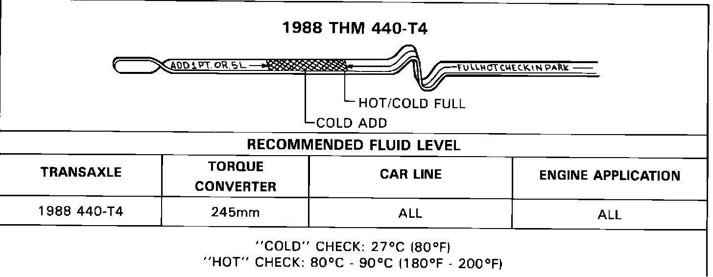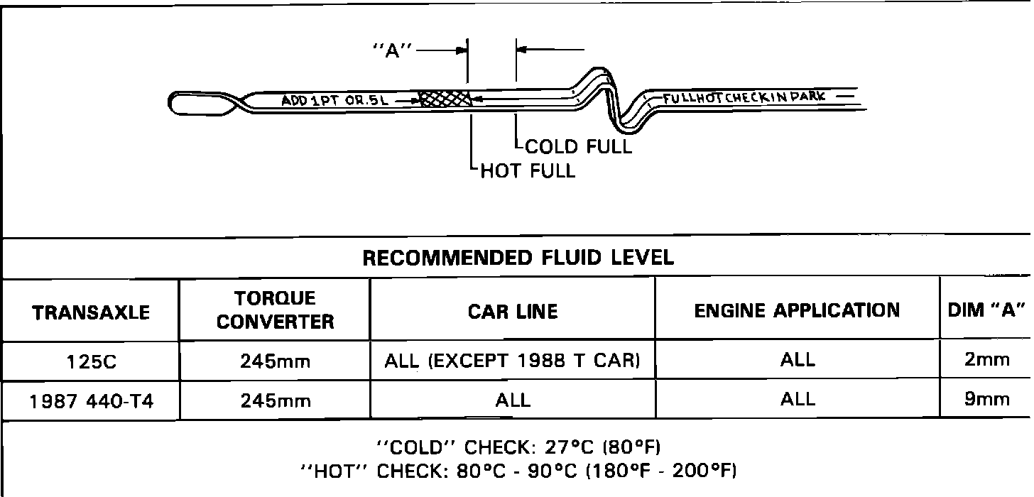 When cold, 27 Degrees C (80 Degrees F), a full THM 125C and 440-T4 transaxle will show the fluid level to be above the "Full Hot" mark on the fluid level indicator (refer to Figures 2, 3, and 4). This is a result of the fluid that is stored in the bottom pan when the transaxle is cold. As the transaxle warms to normal operating temperature fluid is captured in the side pan lowering the fluid level to within the cross-hatched area on the fluid level indicator.