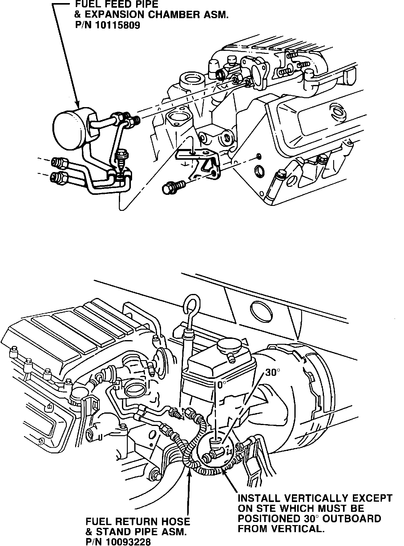 15. On 1987 Model Vehicles Only, connect new fuel return hose - stand pipe assembly, P/N 10093228, to chassis fuel return pipe as shown in Illustration. Torque fitting to 20-34 N-m utilizing backup wrench and insuring stand pipe is maintained in position noted in Illustration.