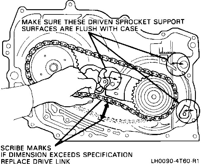 Inspect: 1) Midway between the sprockets and at right angles to drive link, with light pressure push the slack strand (bottom strand) of the drive link until all slack is removed, and mark the case with a pencil on the bottom side of the drive link. See Figure 1.