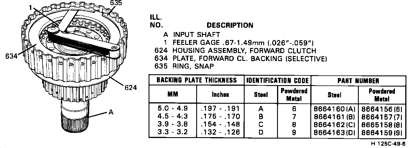 To check the forward clutch backing plate selection, apply approximately 10 lbs. of pressure on the backing plate and check the gap between the backing plate and snap ring. If the gap is larger than 1.49 mm use the next thicker backing plate and if smaller than 0.67 use the next thinner backing plate. Refer to figure 2 for alternate backing plate selections.