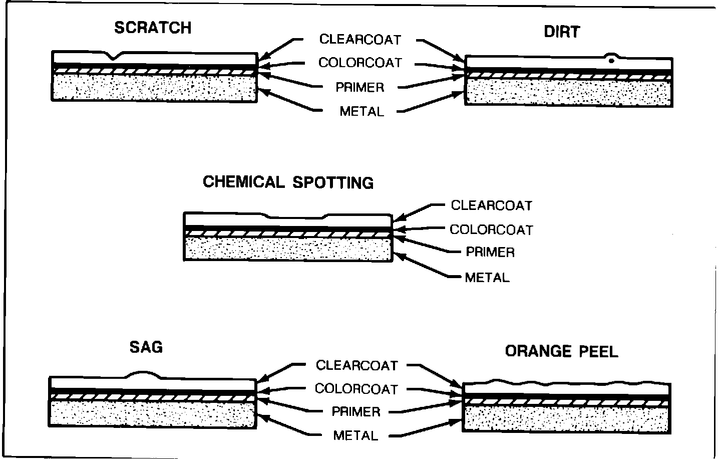 Chemical spotting along with other minor paint imperfections on base coat/clear coat finishes, such as sand scratches, dirt in paint, sags and orange peel can be repaired without paint application. Examples of these imperfections are shown in Figure 1.