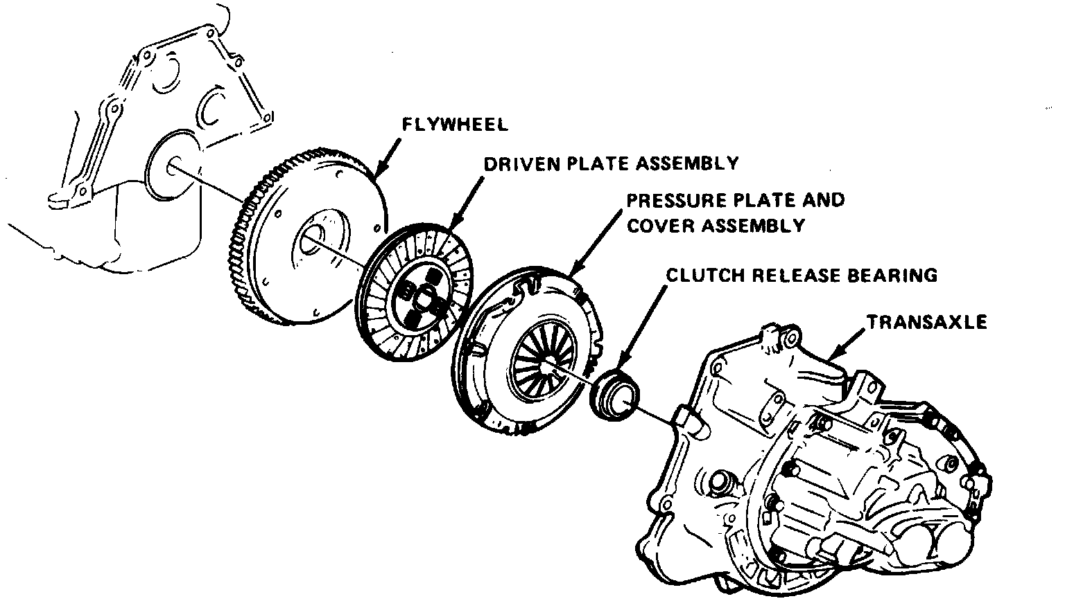 4. Support pressure plate and remove mounting bolts, pressure plate and driven disc, see accompanying figure.