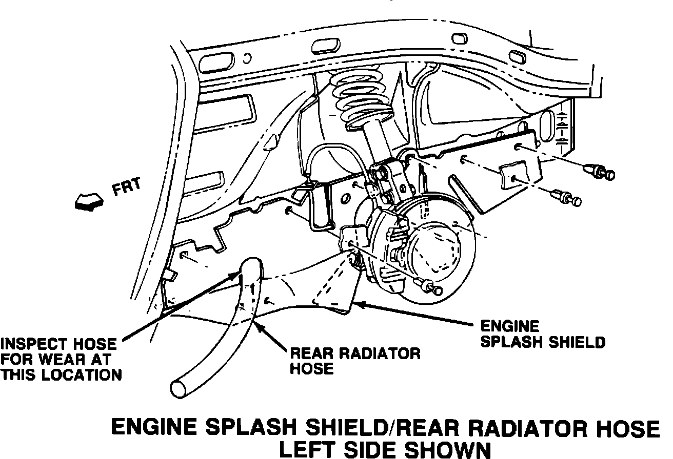 1. Raise vehicle on hoist and inspect right and left-hand radiator hoses for wear from contact with engine splash shield (reference Figure 1). If the core of either radiator hose is exposed, replace hose per appropriate service manual instructions.