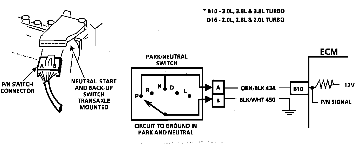 The park/neutral switch contacts are a part of the neutral start switch and are closed to ground in park or neutral, and open in drive ranges. The ECM supplies ignition voltage through a current limiting resistor to CKT 434 and senses a closed switch when the voltage on CKT 434 drops to less than one volt. The ECM uses the P/N signal as one of the inputs to control: