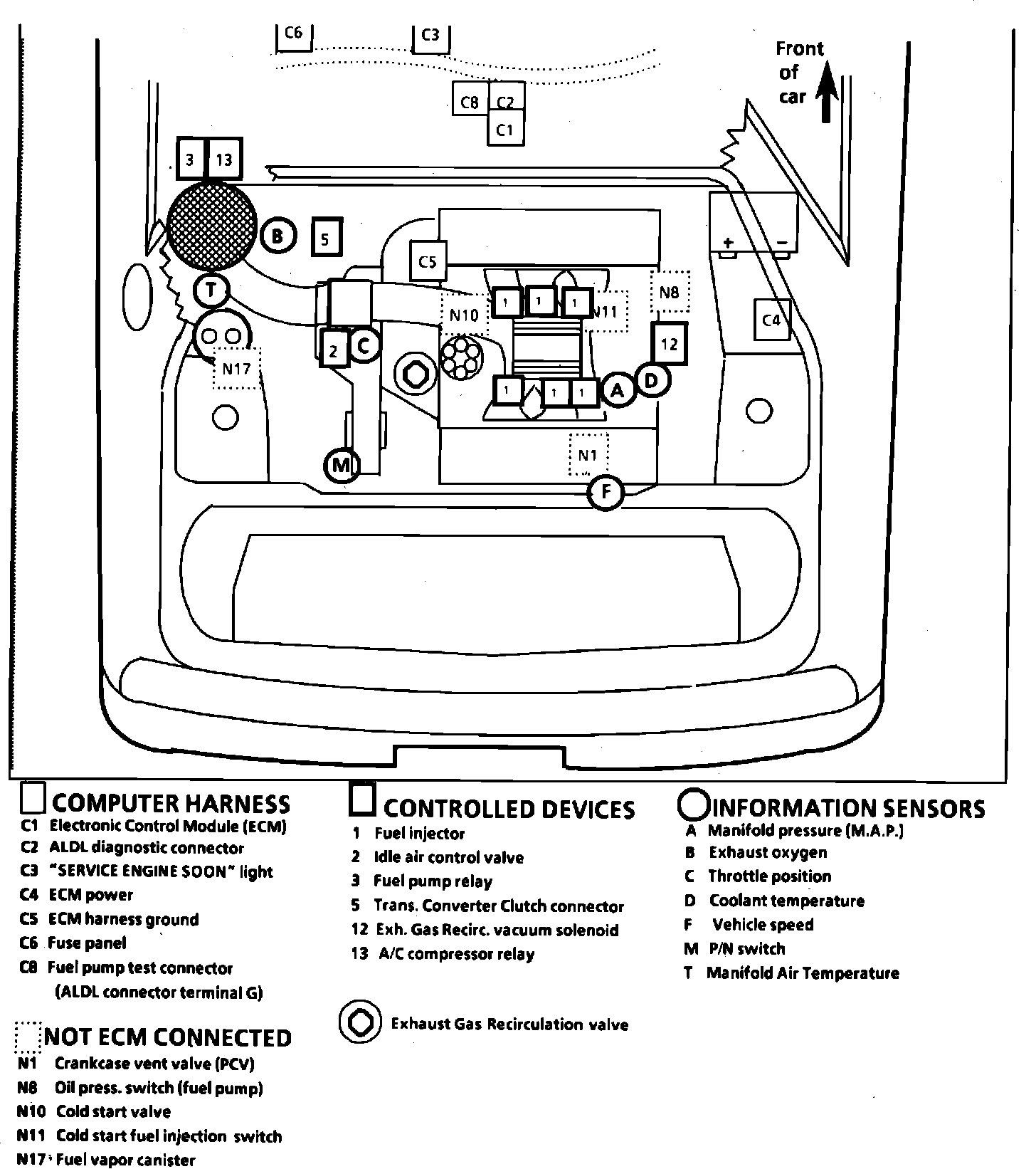 Fig. 69 Emission Component Location. 1987 Fiero W/V6-173/2.8L, PFI: