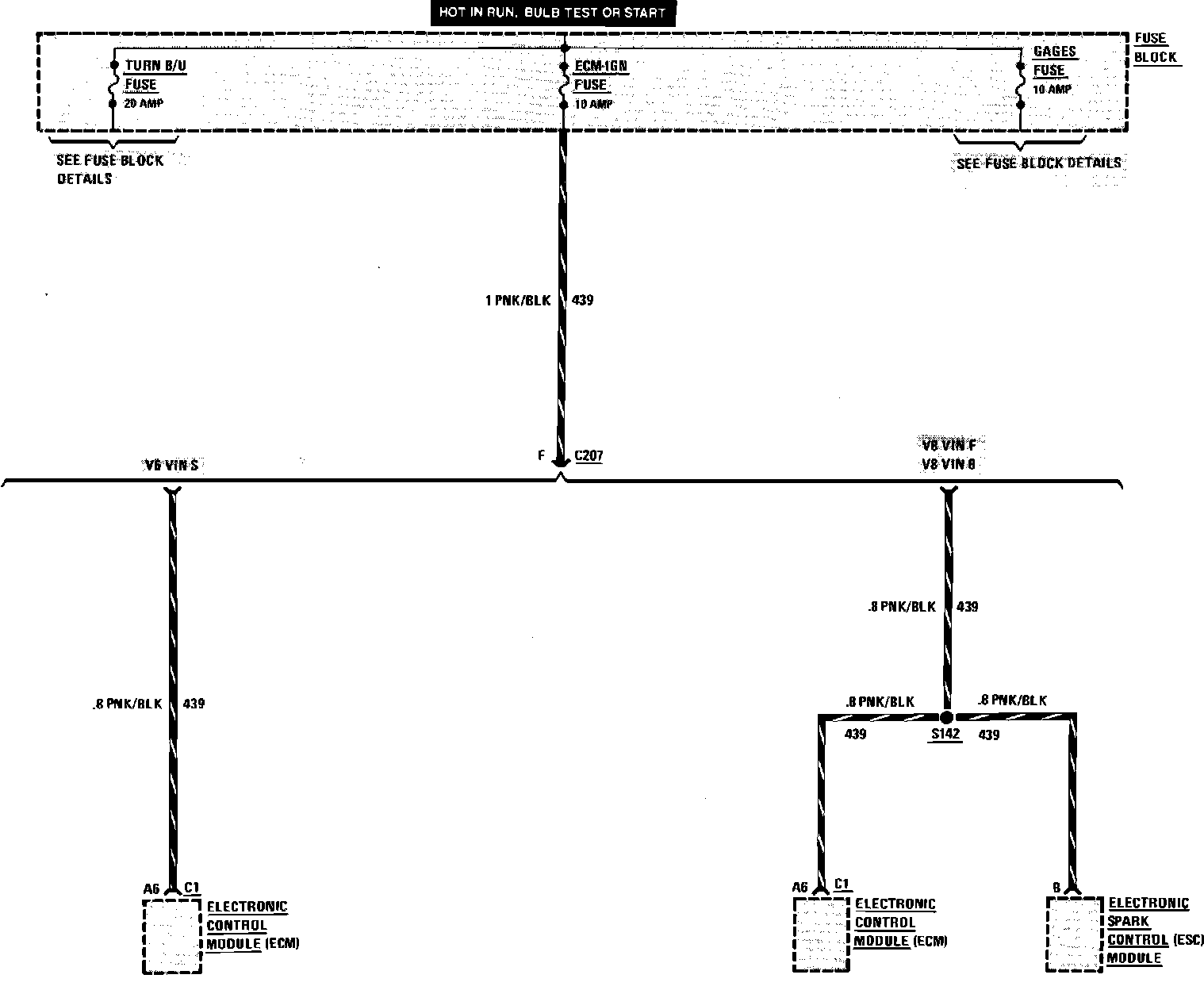 Fuse Block Details (ECM-IGN Fuse). W/V6-173/2.8L, V8-305/5.0L (VIN F) & V8-350/5.7L (VIN 8):