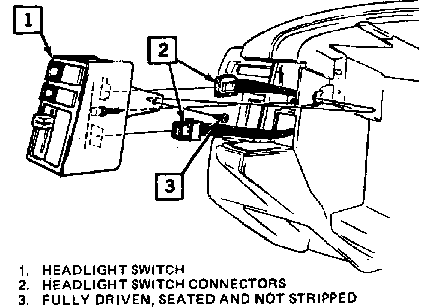 5. On all models, remove switch retaining screws, pull switch assembly away from instrument panel, Figs. 1 and 2, and disconnect electrical connectors as needed to complete removal.