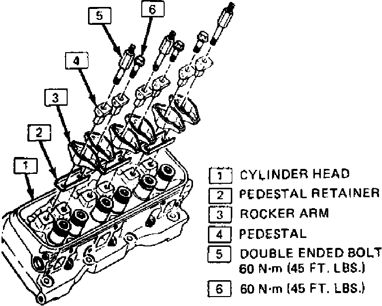 2. Remove rocker arm pedestal retaining bolt, noting position of double ended bolts for assembly.
