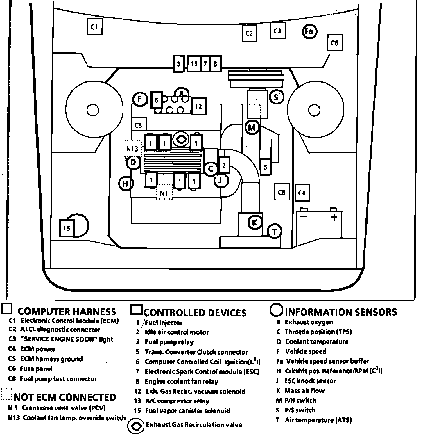 Fig. 71 Emission Component Location. 1987 Calais W/V6-183/3.0L, PFI: