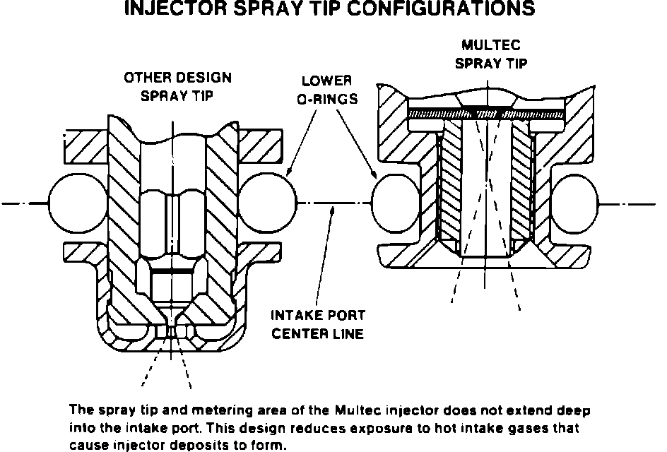 The ball and seat design of the Multec injector eliminates the need of ever having to use an injector cleaner. By design, the fuel metering portions of the injector are not directly exposed to the intake manifold gases that are responsible for the build-up of deposits that can cause injectors to clog. (see Figure 1).