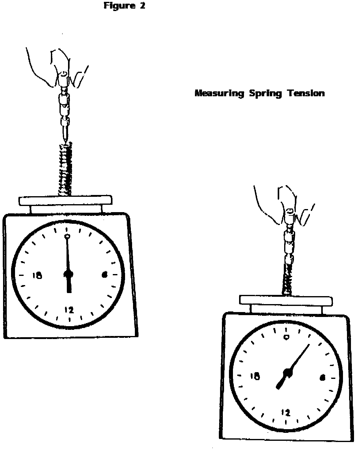 To weigh the spring, compress the spring with the valve on a scale until the stem touches the scale, then read the scale (See Figure 2).