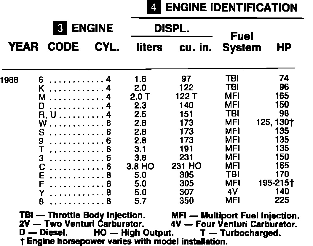 4 - ENGINE IDENTIFICATION: On the line where the engine code appears, read to the right to identify the engine.