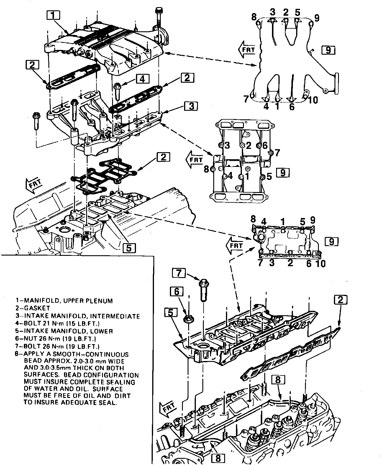 15. Reverse procedure to install. Refer to Fig. 3 for torque sequence. Torque lower intake manifold bolts to 19 ft. lbs. Torque intermediate intake manifold bolts to 15 ft. lbs. Torque upper manifold plenum bolts to 19 ft. lbs.