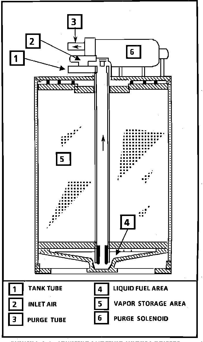 The evaporative emission control system used on this vehicle is the charcoal canister storage method. This method transfers fuel vapor from the fuel tank to an activated carbon storage canister to retain the vapors when the vehicle is not operating. When the engine is running the fuel vapor is purged from the carbon element by intake air flow and consumed in the normal combustion process.