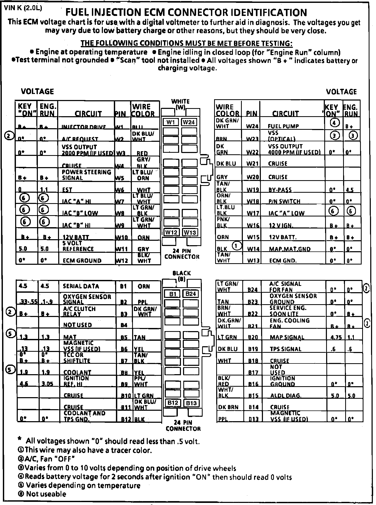 Fig. 018 ECM Connector Terminal I.D. & Volt. Specifications: