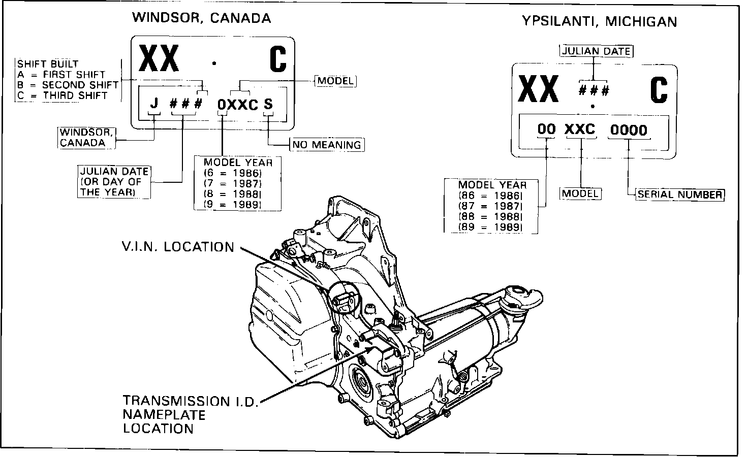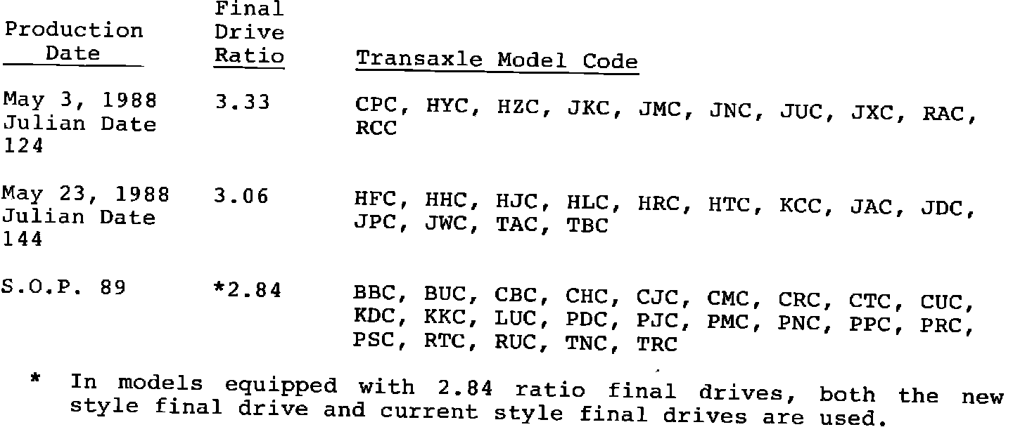 May 3, 1988 (Julian Date 124) for all THM 125C transaxles using a 3.33 ratio final drive assembly. May 23, 1988 (Julian Date 144) for all models using the 3.06 ratio final drive assembly and S.O.P.. 1989 for some models using the new style 2.84 ratio final drive assembly.