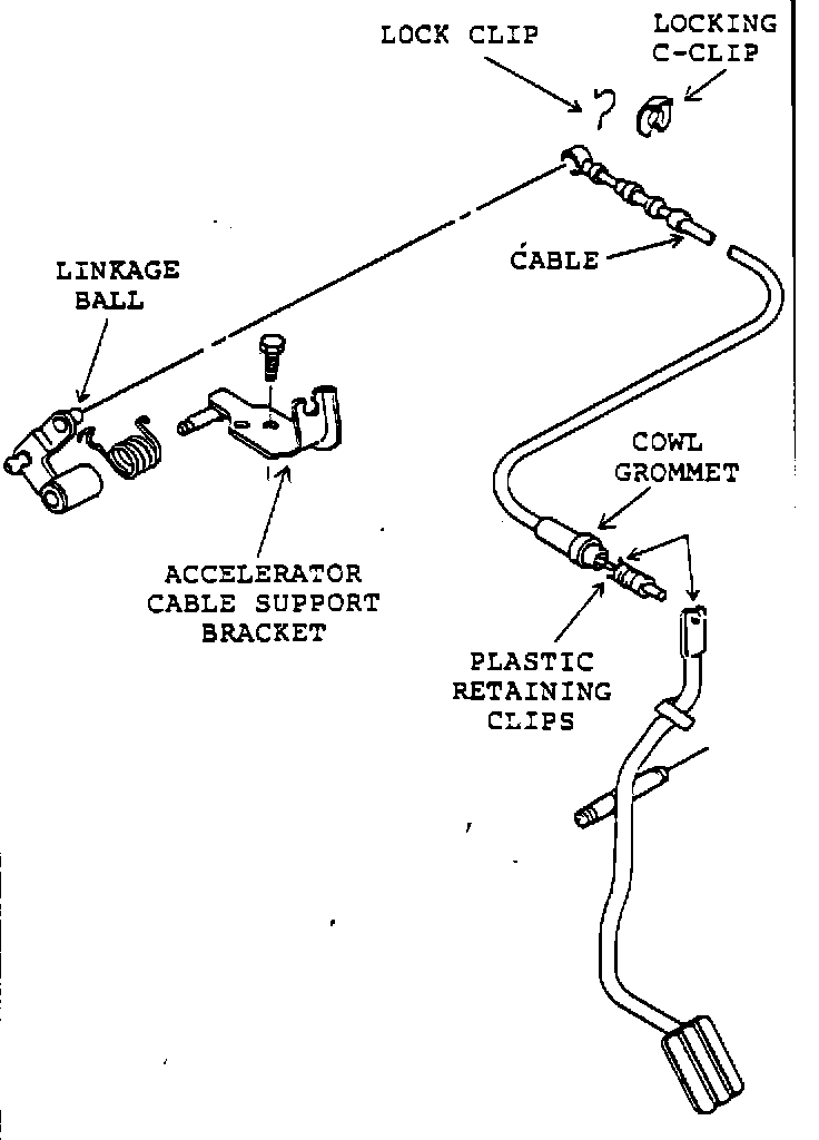 8. From inside vehicle, disconnect cable from accelerator linkage by squeezing plastic retaining clips and pulling rearward (see Figure 2).