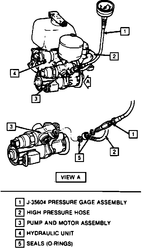 b. Remove accumulator, then install pressure gauge tool No. J-35604-88 or equivalent as shown in Fig. 4. Torque pressure gauge to 32 ft. lbs.