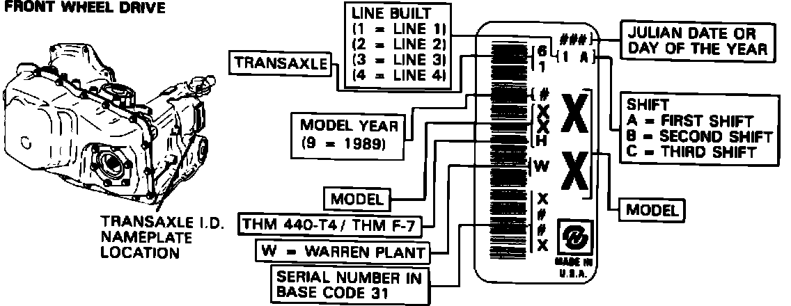 FIGURE 1 - THM 440-T4 (HYDRA-MATIC 4T60)/THM F-7 TRANSAXLE IDENTIFICATION INFORMATION:
