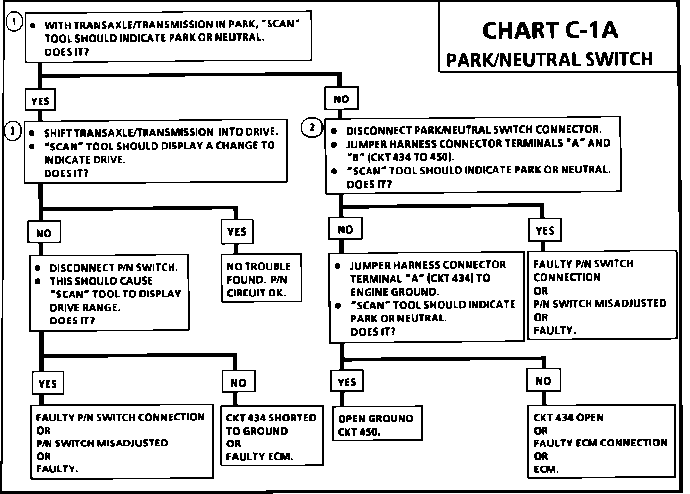 1. Checks for a closed switch to ground in park position. Different makes of "Scan" tools will read P/N differently. Refer to operators manual for type of display used for a specific tool.