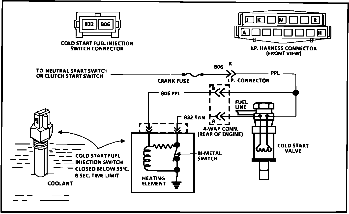 This circuit is activated only in the crank mode. The power is supplied directly from the starter solenoid and is protected by a fuse. The system is controlled by a cold start fuel injection switch which provides a ground path for the valve during cranking when engine coolant is below 95~F (350~C).