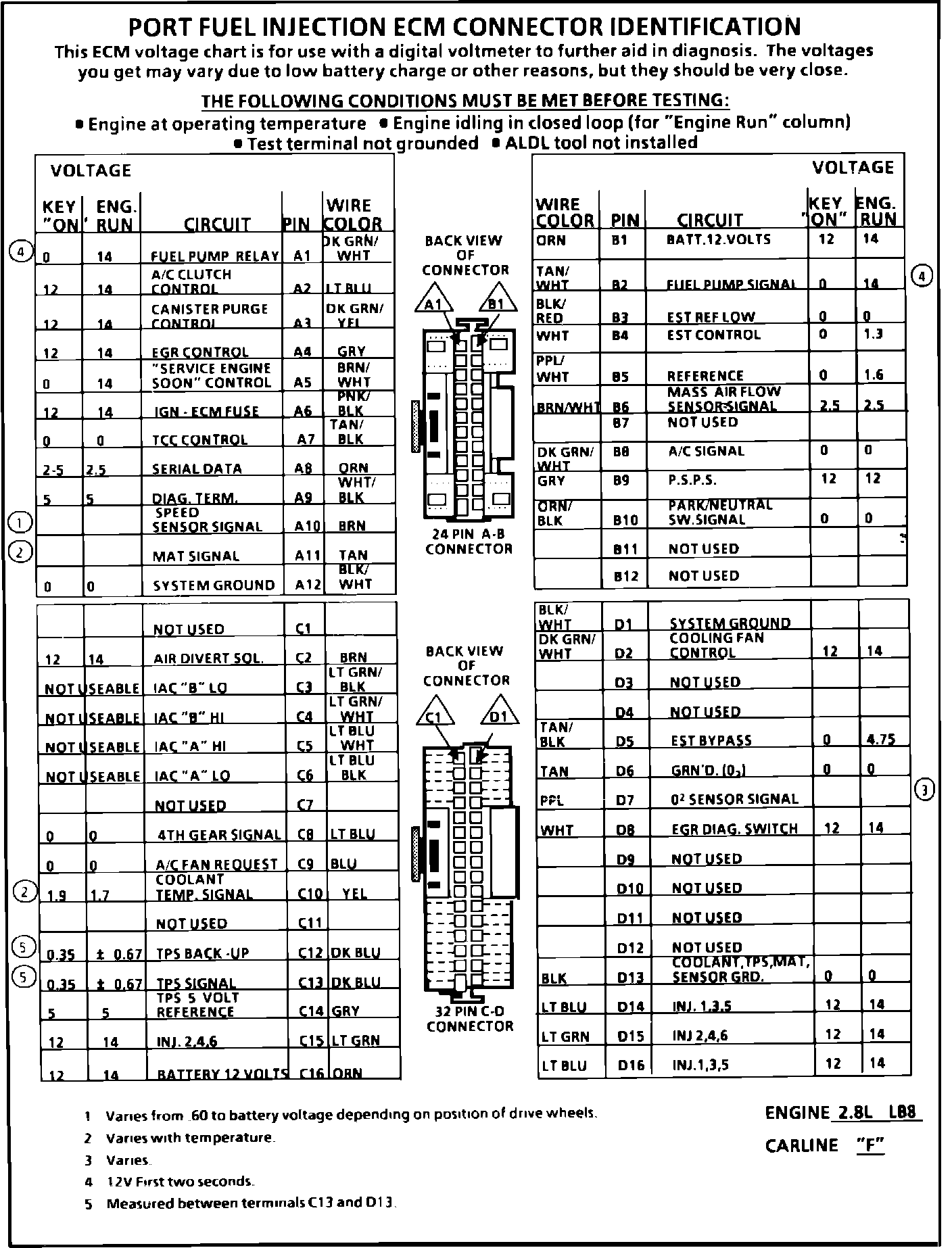 ECM Connector Terminal Identification And Voltage Specification: