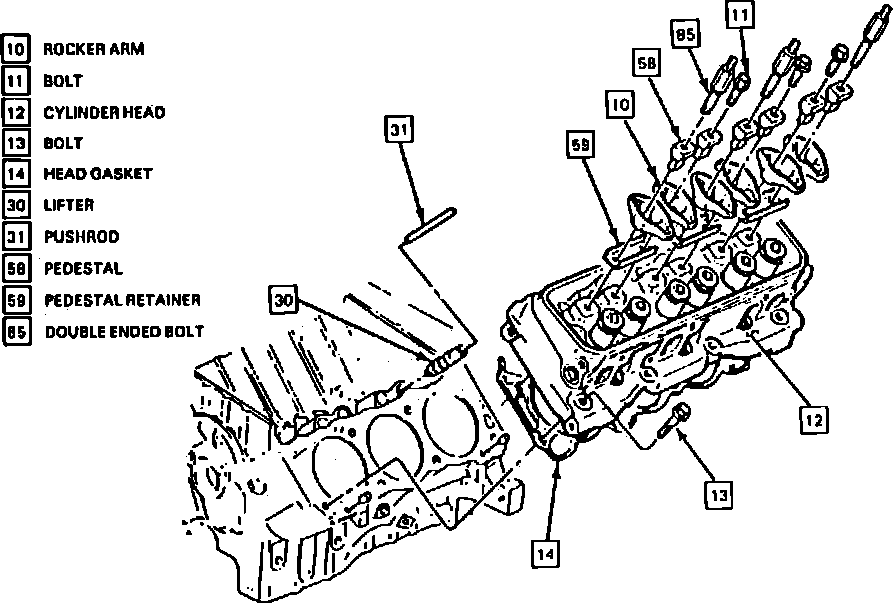 3. Remove pedestals, rocker arms pedestal retainers and push rods. Note location of components for use during installation.