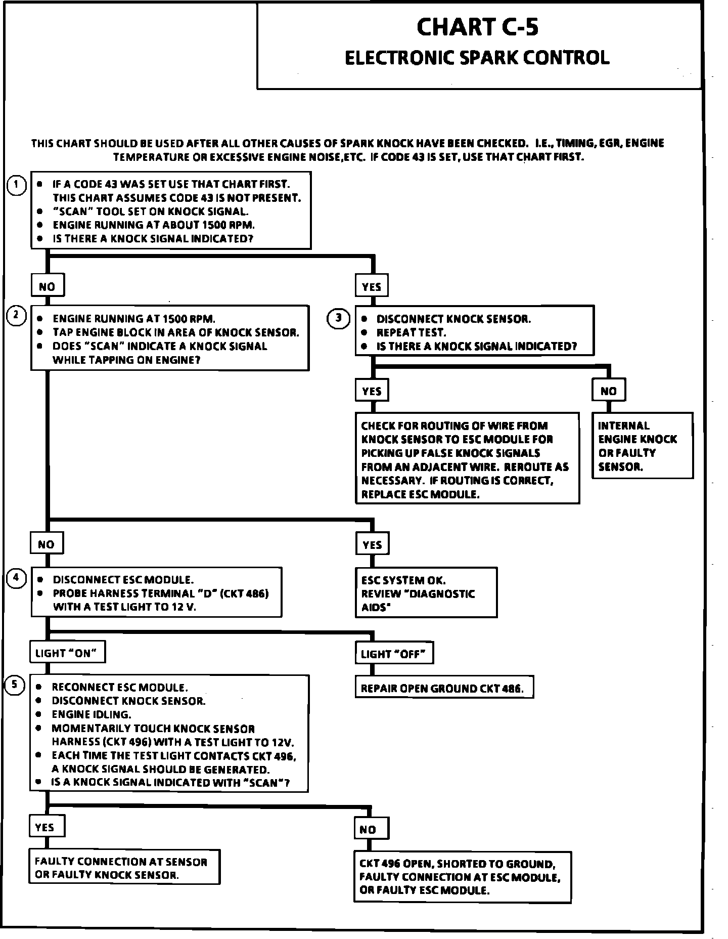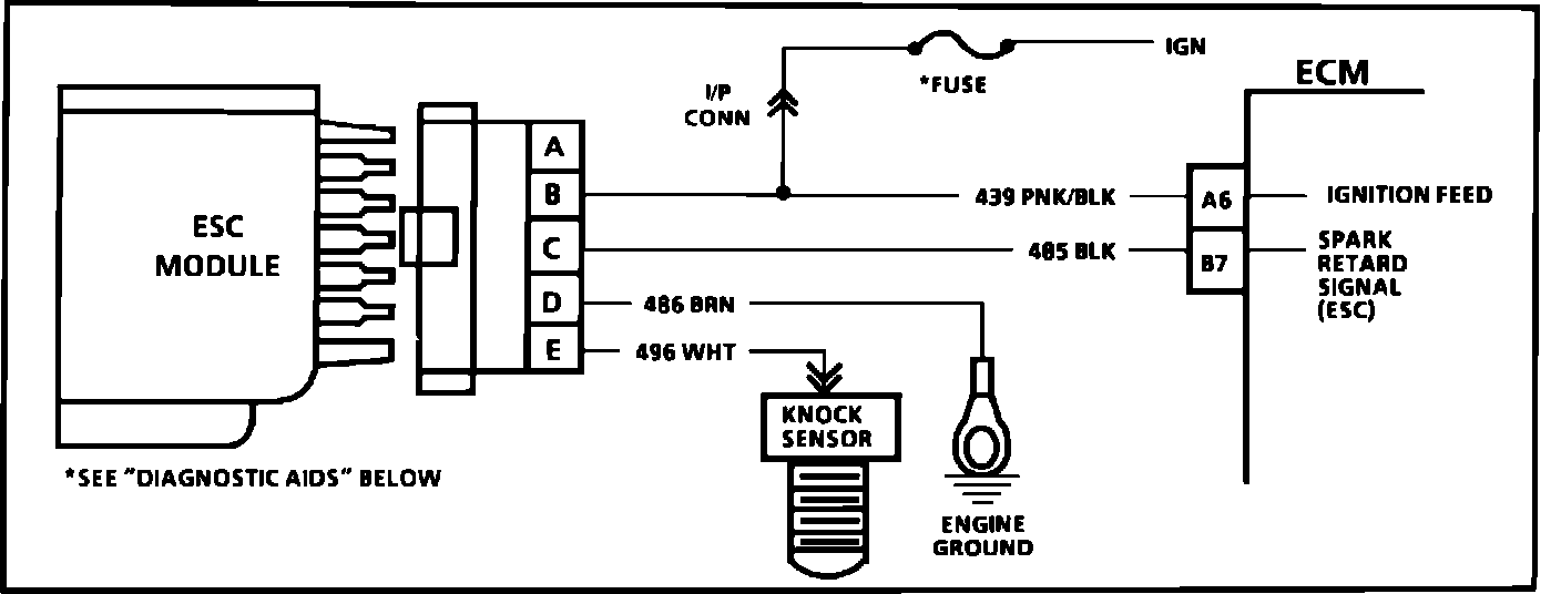5. Contacting CKT 496, with a test light to 12.0 volts, should generate a knock signal to determine whether the knock sensor is faulty, or the ESC module can't recognize a knock signal.