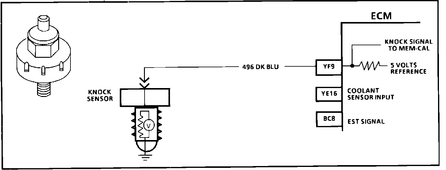 The knock sensor is used to detect engine detonation and the ECM will retard the electronic spark timing based on the signal being received. The circuitry, within the knock sensor, causes the ECM's 5.0 volts to be pulled down so that under a no knock condition, CKT 496 would measure about 2.5 volts. The knock sensor produces an AC signal, which rides on the 2.5 volts DC voltage. The amplitude and frequency are dependent upon the knock level.